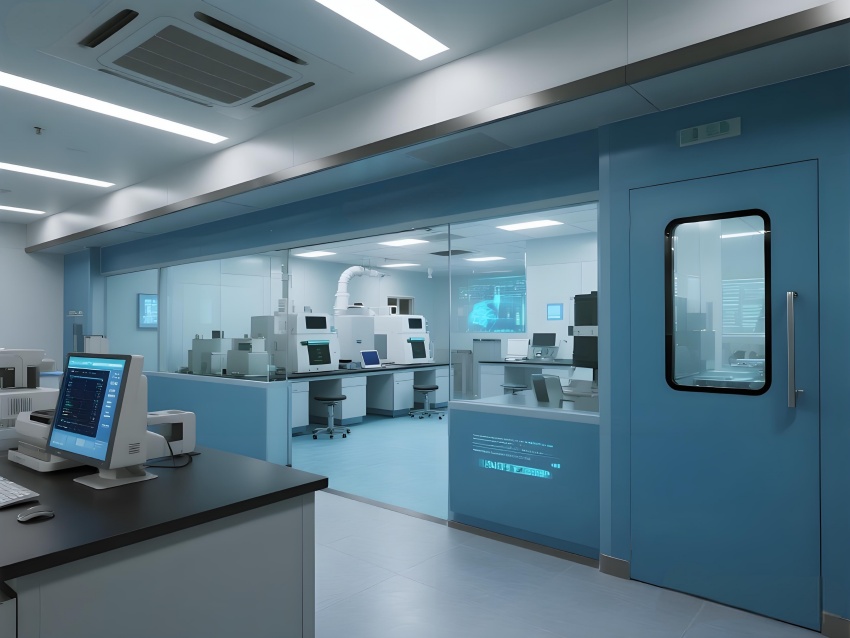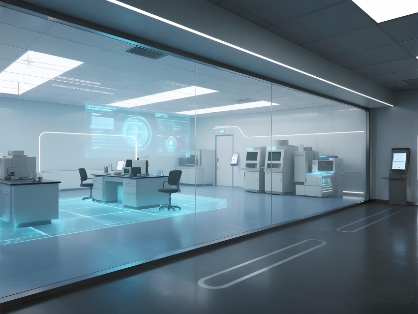 本實驗室以"絕對環境控制"為核心設計理念,整體采用冰川藍與鈦白灰的漸變配色。墻面嵌入式環境參數監測屏實時流動著翡翠綠數據流,與頂棚矩陣排列的微孔送風口形成科技韻律。核心實驗區采用圓弧形防結露玻璃隔斷,內置百級潔凈層流罩。地面鋪設防靜電陶瓷鋼板,接縫處嵌入LED環境達標指示燈。設備區裸露的銀色保溫管道與藍色冷媒管構成工業美學展陳,智能除濕機組通過半透明外殼展示內部冷凝過程。數據中控室配備270°曲面監控屏,懸浮粒子濃度以動態星云圖呈現。空間通過嚴謹的幾何分割與流體力學曲線結合,在極致環境控制要求下,打造出兼具科研嚴肅性與星際艙未來感的頂級實驗環境。