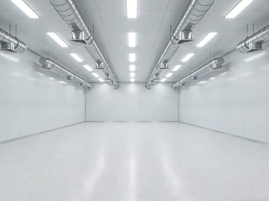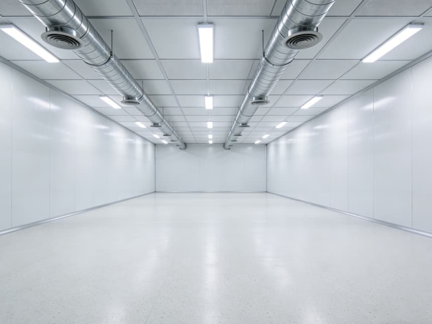 車間統一遵循半導體級潔凈標準,地面為淺灰色防靜電環氧地坪,墻面采用白色無縫抗菌涂層,消除清潔死角。各車間功能精準分區:外延生長車間預留恒溫恒濕及氣體管路接口,適配高純度氣體輸送;光刻車間采用密閉避光設計,預留高效過濾送回風系統;蝕刻車間強化耐腐蝕處理,配備排風凈化預留接口;封裝測試車間規劃分區工位,預留精密檢測設備安裝基礎。