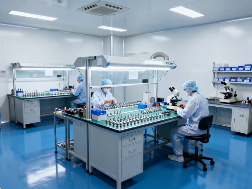 本無菌醫(yī)療器械生產(chǎn)廠房整體遵循GMP無菌生產(chǎn)標準,以藍色防靜電潔凈地坪搭配白色抗菌墻面,構建高效凈化體系,適配注射器、植入器械等無菌產(chǎn)品生產(chǎn)。凈化功能貫穿全空間,核心圍繞塵??刂啤⑽⑸镆种萍敖徊嫖廴痉婪叮瑸楫a(chǎn)品質(zhì)量筑牢第一道防線。