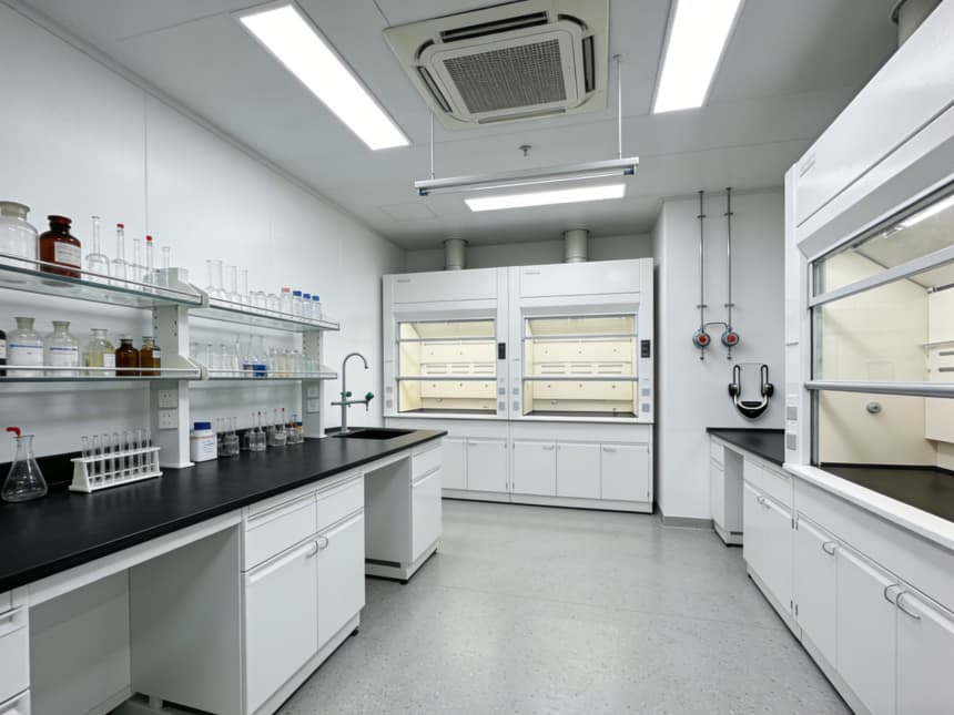 內部檢測空間均以淺灰色耐磨地坪搭配白色無縫潔凈墻面,視覺整潔且適配檢測核心需求。淺灰色地面選用高硬度環氧材質,抗壓耐磨、抗污易清潔,可耐受檢測過程中各類試劑殘留與設備搬運磨損;白色墻面采用環??咕繉?,平整度高、反光均勻,搭配嵌入式防眩光照明,為精密檢測提供清晰穩定的視覺環境,減少誤差干擾。