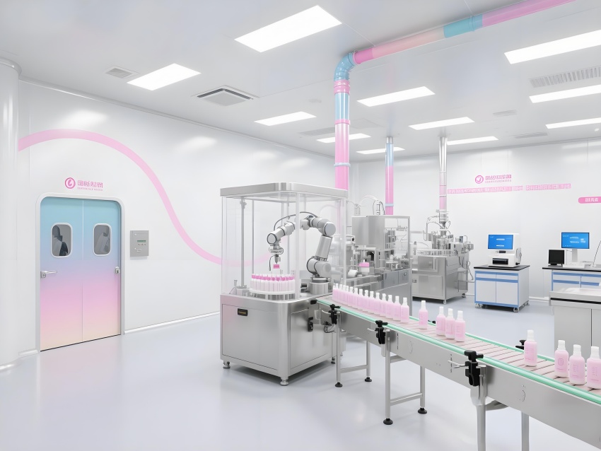 本車間以“科技感純凈美學”為設計語言,將化妝品行業的精致基因融入工業空間。純白主色調搭配品牌標志性的柔光粉點綴,墻面圓弧過渡的彩鋼板與地面淺灰導靜電地板構成潔凈基底。核心灌裝區透明層流罩內,機械臂精準抓取瓶體灌裝,冷銀色設備與粉色功能標識形成視覺對比。頂棚均勻分布的LED平板燈在乳化區投下無影光效,原料輸送管道通過色環編碼清晰區分。質檢實驗室的藍光檢測儀與包裝區高速傳送帶上的產品流,共同構建高效生產韻律。人員通道的智能風淋室采用漸變色玻璃,科技感與人性化并存。整體空間通過嚴格的功能分區與柔和的色彩管理,打造符合國際標準的化妝品智造殿堂。