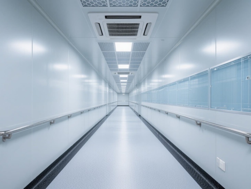 電子芯片廠無塵車間是芯片高精度生產的核心空間,其設計嚴格遵循百萬級潔凈標準。車間以銀白色抗菌彩鋼板搭建墻體與吊頂,搭配淺灰色防靜電環氧地坪,形成簡潔統一的視覺基調。頂部密布的高效過濾器與FFU風機組,通過層流方式持續凈化空氣,確保每立方米空氣中0.5微米以上的塵埃顆粒不超過3520個。?