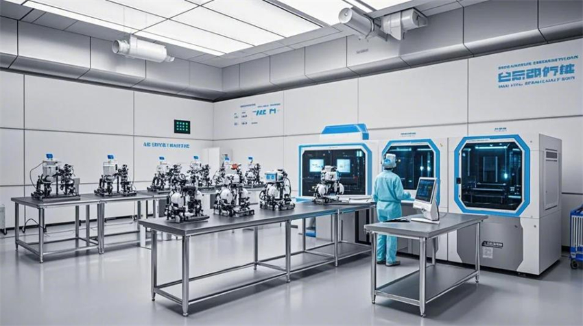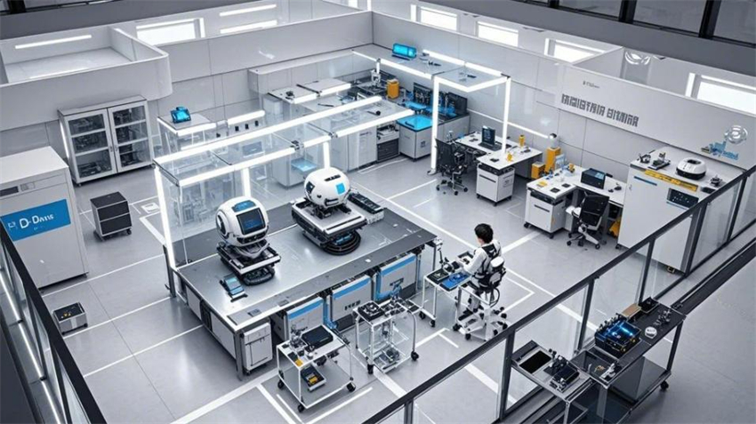 機械人研發實驗室,未來科技風格。實驗室分為研發區、測試區、裝配區和辦公區。研發區占50%,測試區占30%,裝配區占10%,辦公區占10%。研發區:防靜電環氧地坪(淺灰色),白色彩鋼板墻面和天花板,頂部高效過濾器(HEPA),不銹鋼工作臺,機械人原型和3D打印機排列整齊。測試區:機械人測試平臺,地面為防靜電PVC地板(淺色)。裝配區:工具架整齊,機械人部件分類存放。辦公區:玻璃隔斷,現代簡約辦公桌。整體色彩:白色、淺灰色、科技藍點綴。